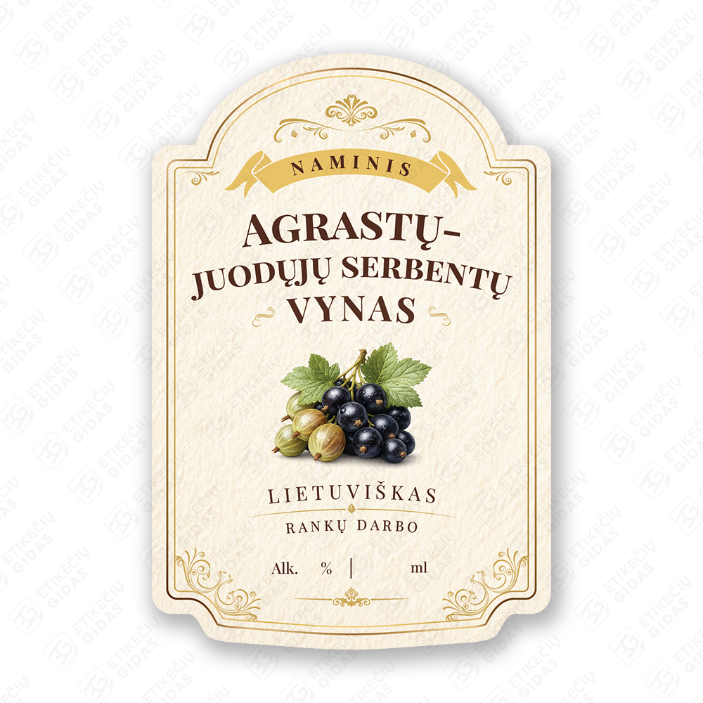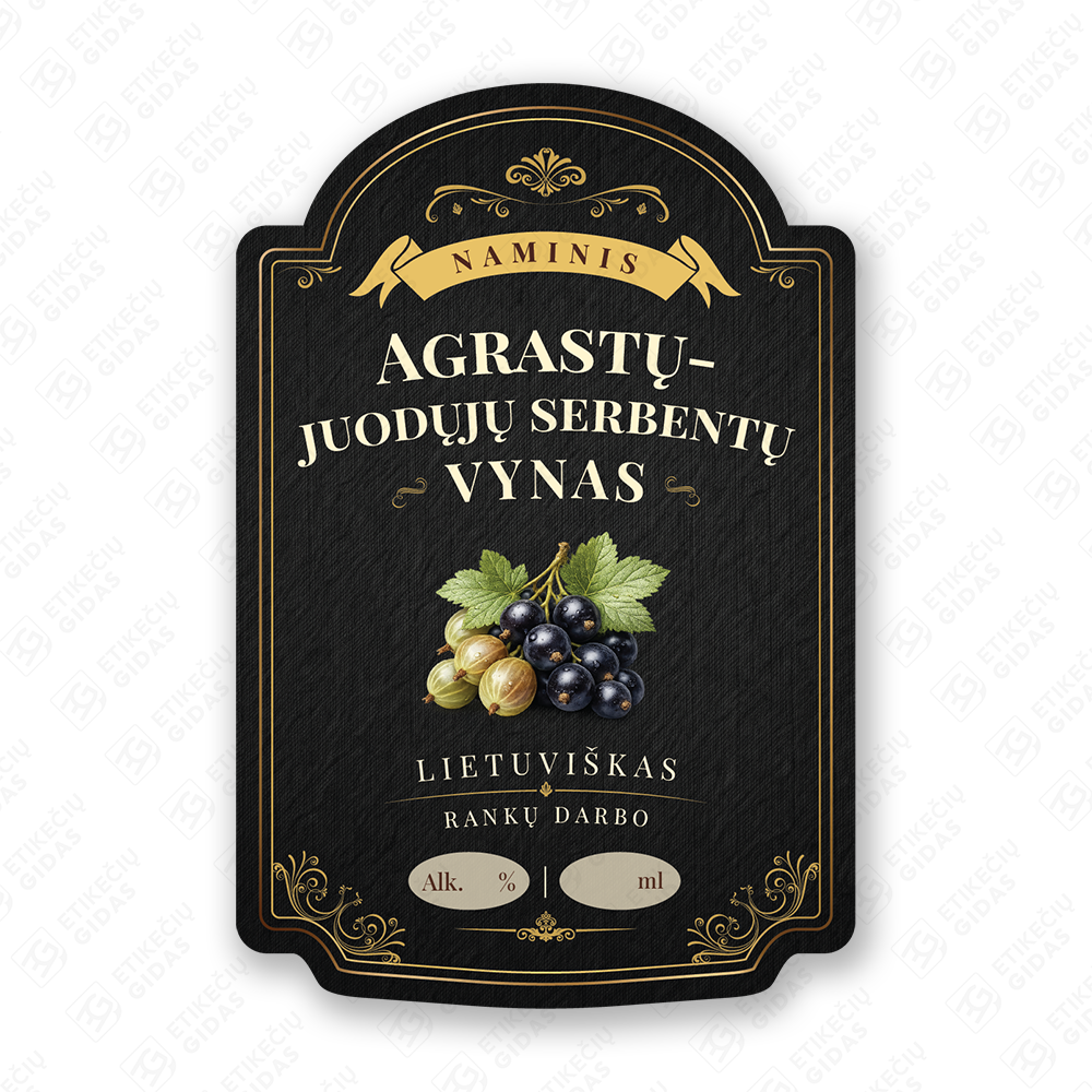Suteikite savo naminiam agrastų – juodųjų serbentų vynui profesionalią išvaizdą! Elegantiško dizaino, drėgmei atsparios lipnios etiketės sukurtos specialiai standartiniams vyno buteliams.