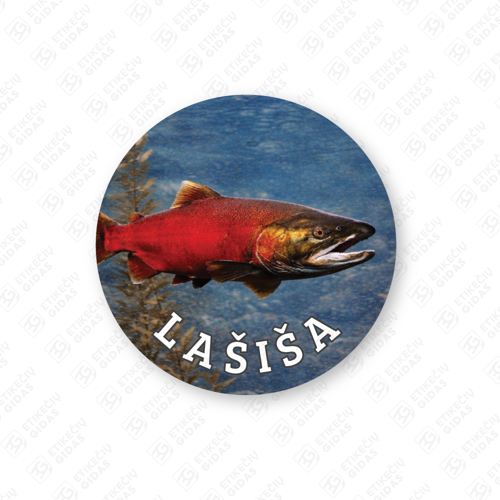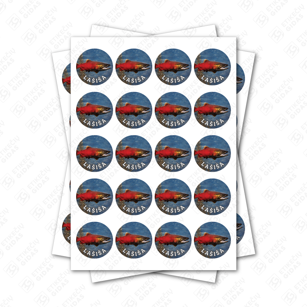Apvalūs lašišos konservų lipdukai 30 mm lapuose su standartiniais klijais