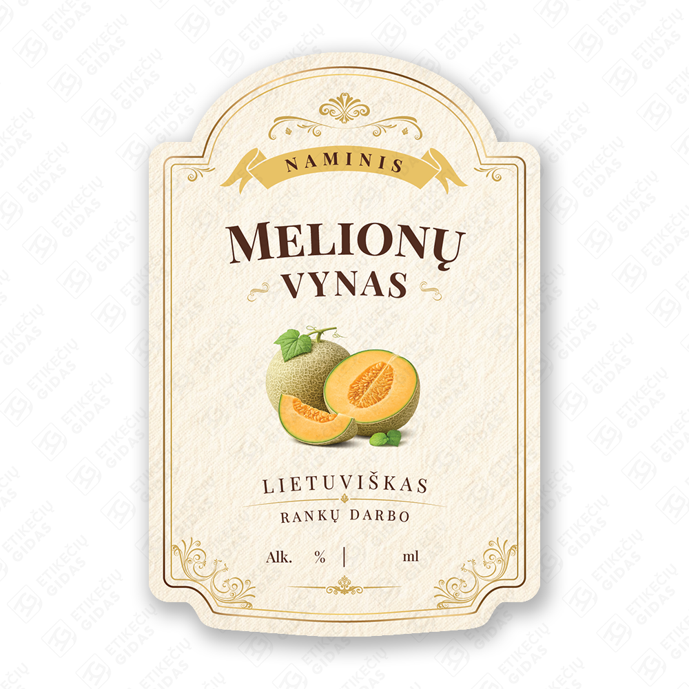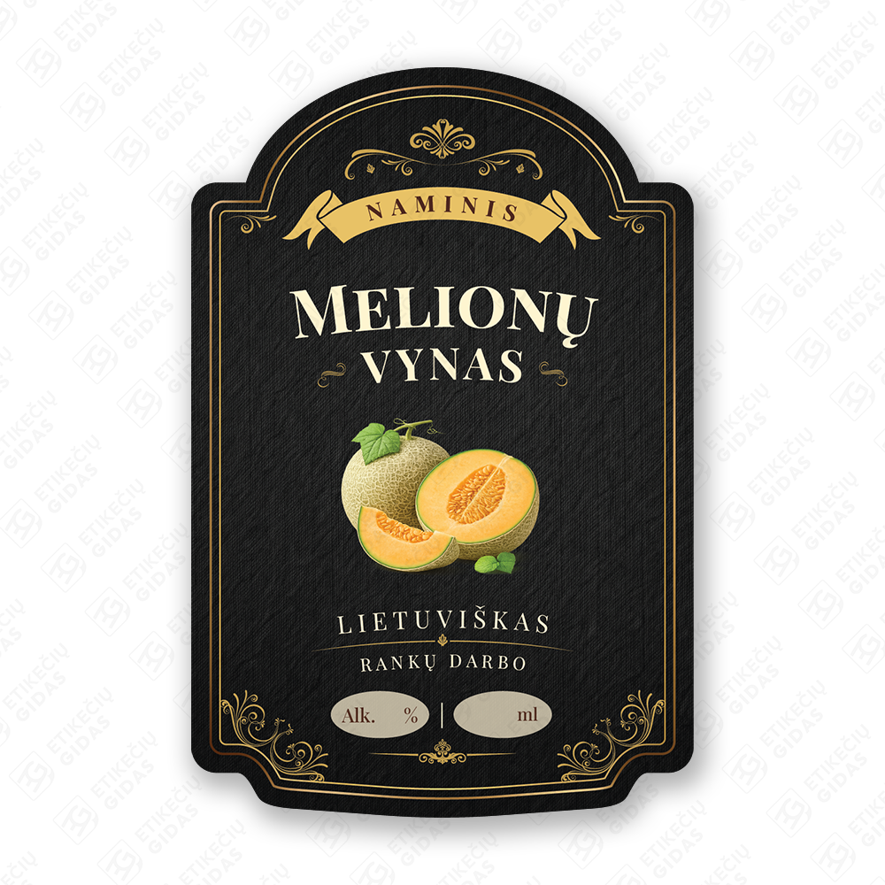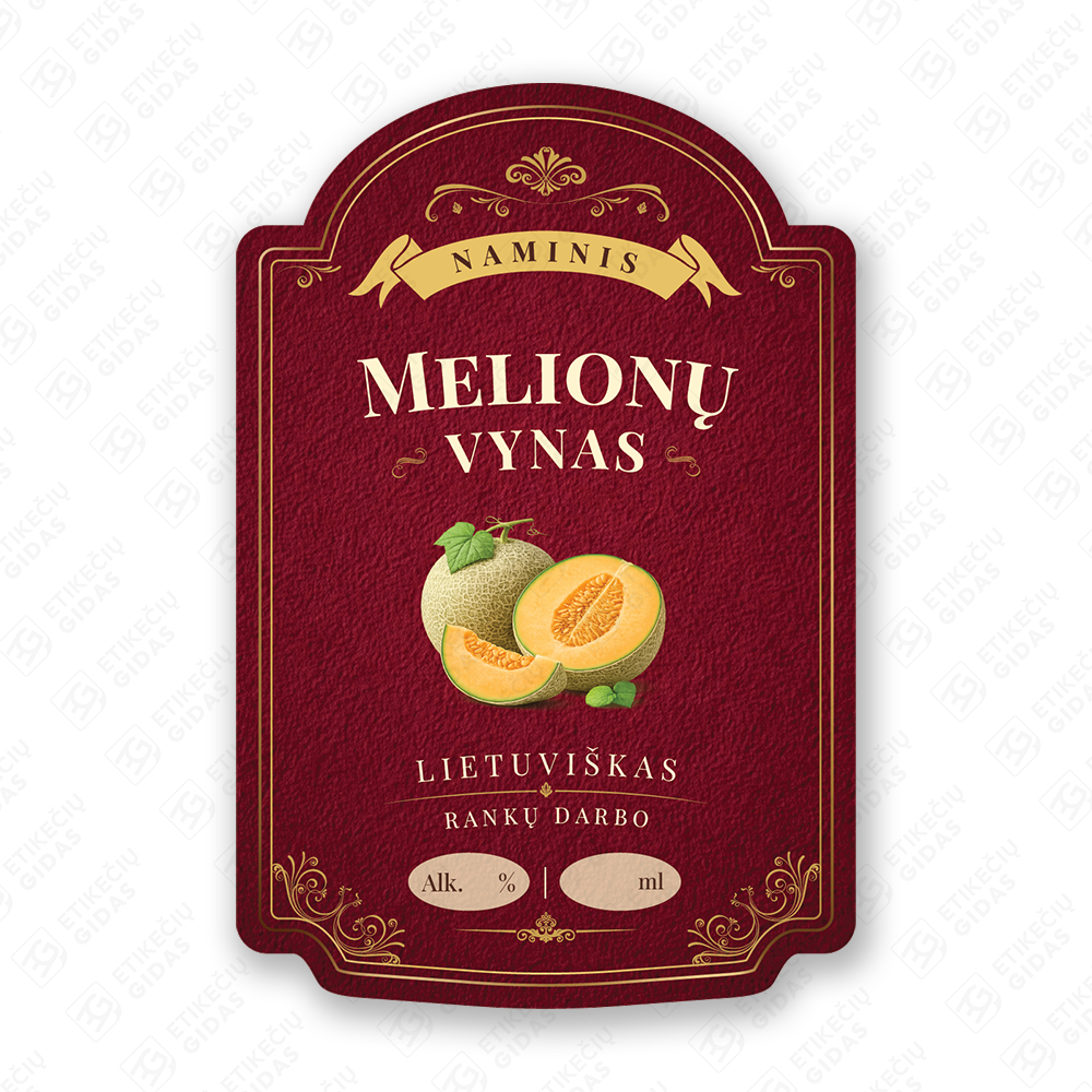 Suteikite savo naminiam melionų vynui profesionalią išvaizdą! Elegantiško dizaino, drėgmei atsparios lipnios etiketės sukurtos specialiai standartiniams vyno buteliams.