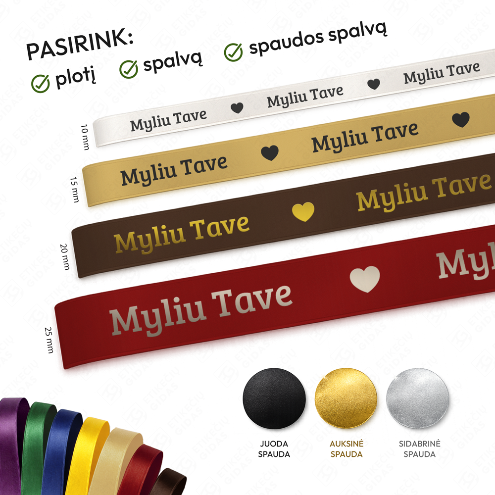 Satino juosta su spauda – įvairios spalvos ir spaudos variantai