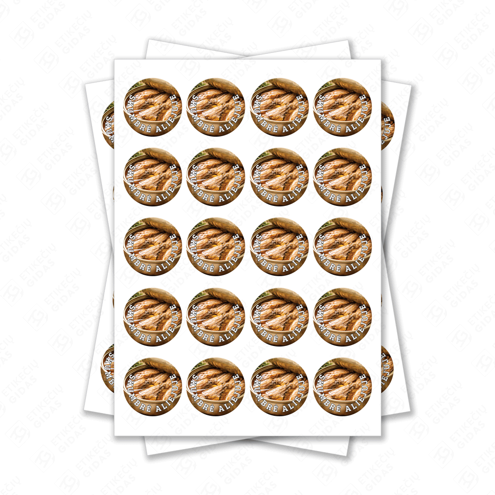 Apvalūs skumbrės aliejuje konservų lipdukai 30 mm lapuose su standartiniais klijais